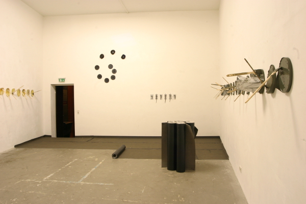 von dort ins Atelier. Ideen, Gegenstände und Materialien werden von der Künstlerin beim Arbeiten auf dem Bau gesammelt und als fertige Werke behandelt oder durch Materialexperimente in neue Form gebracht.